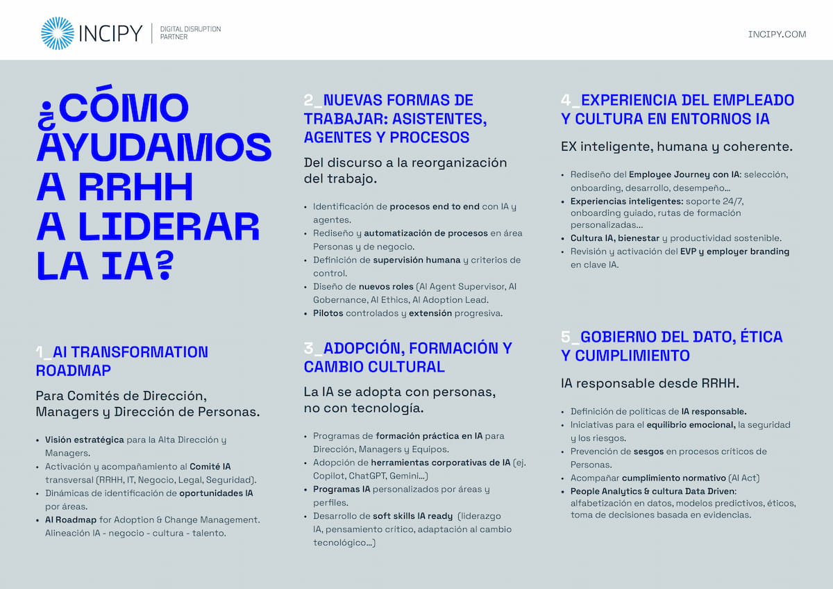 Si algo tenemos muy claro en INCIPY es que, en este 2026, la Inteligencia Artificial se consolida como una transformación real en la función de Personas, por lo que los departamentos de RRHH asumen un papel estratégico para impulsar una adopción ordenada, medible y alineada con el negocio y con la organización.