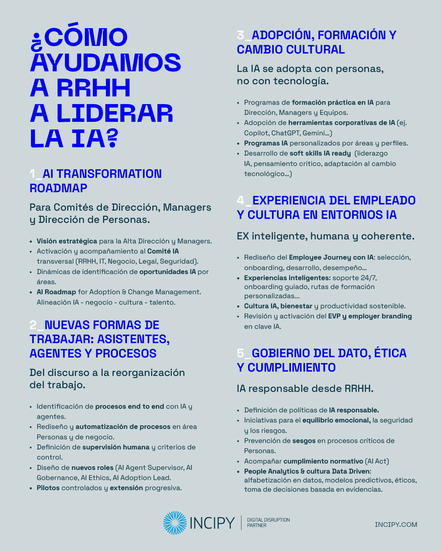 Desde INCIPY acompañamos a las organizaciones en la definición y despliegue de su IA Roadmap en RRHH, ayudando a pasar de la experimentación a una adopción real, gobernada y con impacto en negocio y personas. Trabajamos la estrategia, la gobernanza, la formación, adopción y la gestión del cambio para integrar la IA de forma sostenible en la función de Personas.